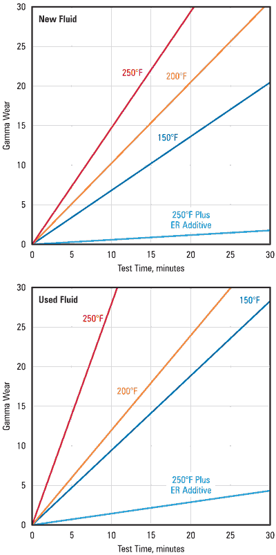 Close comparison of Figure 2 reveals depletion of the antiwear additive in the used oil, significantly reducing its effectiveness. Also, the fluid viscosity may have been sheared down to the point where the lubrication film thickness has become totally inadequate to prevent asperity contact wear. Notice that when engineers add a special antiwear additive (identified as ER) to both new and used fluids and perform the same wear test at the most severe operating temperature of 250°F, the wear rate becomes trivial.